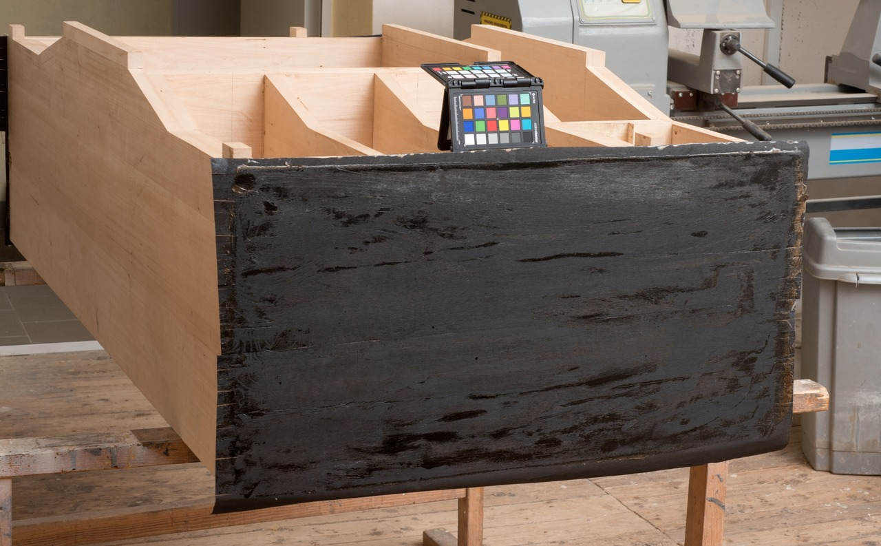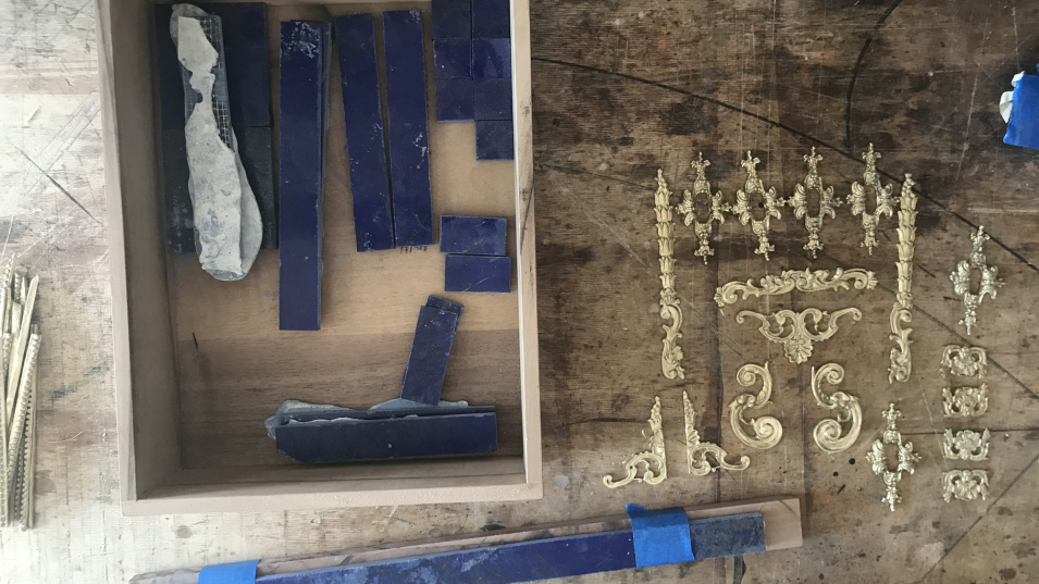Kolejny etap prac zakładał okleinowanie konstrukcji, czyli pokrycie jasnego drewna lipowego fornirem hebanowym. Fornir, inaczej okleina, to cienki płat drewna służący jako zewnętrzna warstwa zdobiąca mebel. Technika okleinowania znana jest od starożytności, a jednym z jej celów jest oszczędzanie rzadkich, wzorzystych gatunków drewna. Ta metoda zdobnicza daje możliwość układania płatów drewna w skomplikowane wzory geometryczne, a nawet jeszcze bardziej złożone rysunki. Wyzwaniem było jednak zdobycie odpowiednich materiałów do rekonstrukcji. Bezcenne okazały się kontakty z rzemieślnikami różnych specjalności. Specjalnie zakupiono tarcicę hebanową, czyli deski niepoddane jeszcze obróbce stolarskiej. Dokonano też zakupu kamienia, gdy – szczęśliwie – na aukcjach internetowych pojawiła się duża płyta lapis lazuli. Po dokładnym zwymiarowaniu pocięto ją na fragmenty wymaganej wielkości i grubości – chodziło o wycięcie bardzo cienkich „listków” (płytek). Wyzwanie stanowił rodzaj kamienia, lapis lazuli jest bowiem niejednorodny, zawiera w swojej strukturze kryształy innych minerałów, drobinki metali i inne zanieczyszczenia. Często też w jego masie znajdują się mikroskopijne spękania, niewidoczne na pierwszy rzut oka. Wszystkie te zjawiska wpływają na osłabienie struktury, powodują nagłe pękanie czy wykruszanie podczas cięcia lub polerowania, w najmniej oczekiwanym miejscu. Dlatego, po przeprowadzeniu szeregu prób, wybrano najskuteczniejszą metodę wzmacniania kamienia przed docinaniem; wzmacnianie powierzchni poprzez prowizoryczne przyklejanie do niej siatki poliestrowej, przejmującej naprężenia powstałe podczas wycinania. Następnie po uzyskaniu odpowiedniej grubości płytek (około 5 mm) wzmocnienie usuwano. Dzięki temu rozwiązaniu udało się uniknąć niepotrzebnych strat cennego materiału, którego deficyt był od początku odczuwalny.
