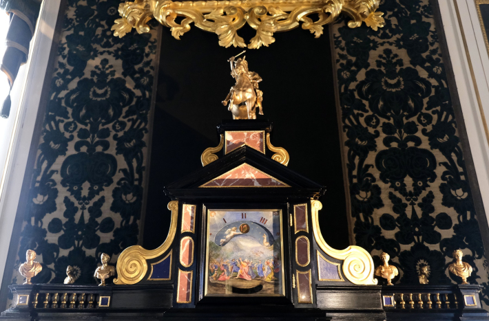 To wyjątkowe dzieło należy do grupy najcenniejszych, najwyższej klasy mebli zwanych kabinetami, które były prestiżową ozdobą apartamentów dworów królewskich. Jest to wieloszufladowa szafa ustawiona na wysokiej podstawie, dekorowana cennymi okładzinami z hebanu, lapis lazuli i wielobarwnego marmuru. Ścianki fasady zdobią miniaturowe malowidła przedstawiające biblijne historie Józefa i Mojżesza. Temat i kompozycja tych scen nawiązuje do dzieł renesansowego mistrza Rafaela Santi w loggiach watykańskich. Centralne miejsce kabinetu zajmuje komora imitująca miniaturową komnatę z lustrzanymi ściankami, kolumnami i dekoracyjną posadzką. W szczycie mebla umieszczono zegar nocny, w zwieńczeniu - wykonane z brązu konne przedstawienie Marka Kurcjusza, legendarnego zbawcy Rzymu i popiersia rzymskich cesarzy. Szuflada w cokole mieściła niezachowany instrument muzyczny zwany wirginałem. Intrygującymi elementami, których funkcja pozostaje tajemnicą, są dwa duże, wysuwane z bocznych ścianek lustra oraz dwie tajne komory.