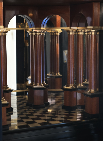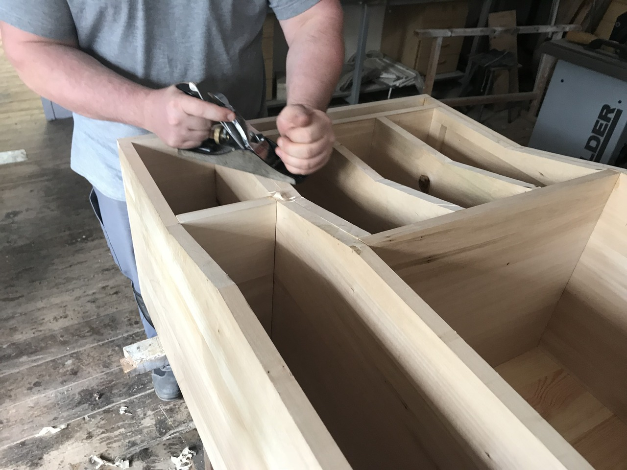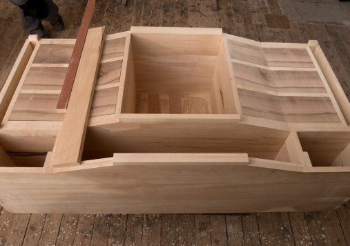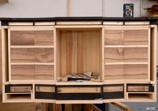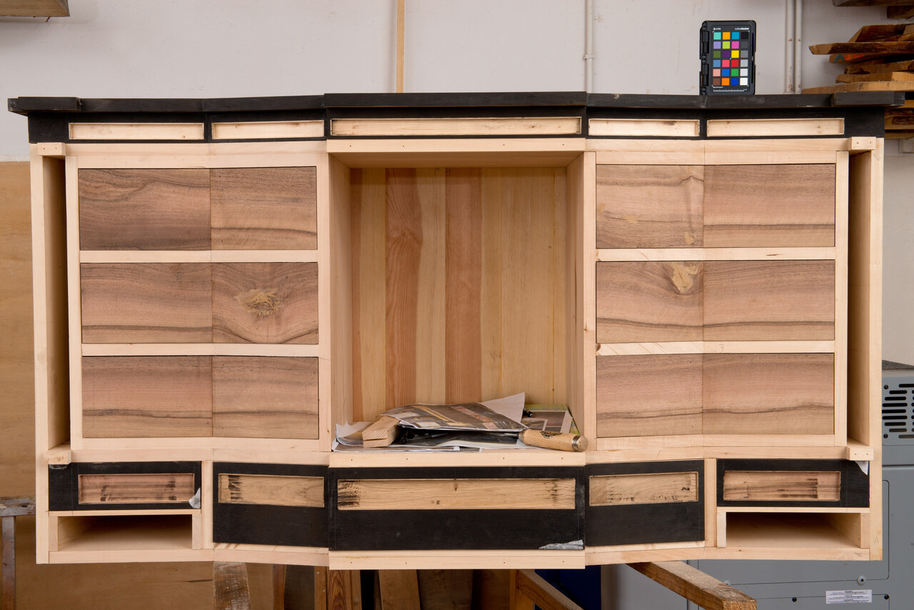 Najwięcej pracy, dużej cierpliwości oraz precyzji wymagały drzwiczki w centralnej części mebla, które były ostatnim zakończonym i zamontowanym elementem. Dużym wyzwaniem było także obudowanie skrzynek wolutowych z obu górnych kondygnacji. Ich profile stanowią odwzorowanie widocznych na froncie wolut. Falista forma wymusiła zastosowanie techniki polegającej na klejeniu wielu wąskich, cienkich listewek hebanowych do szablonu wyciętego we frontowym i tylnym elemencie konstrukcji. Następnie całość ręcznie ostrugano i wyszlifowano, aż do uzyskania gładkiej powierzchni.