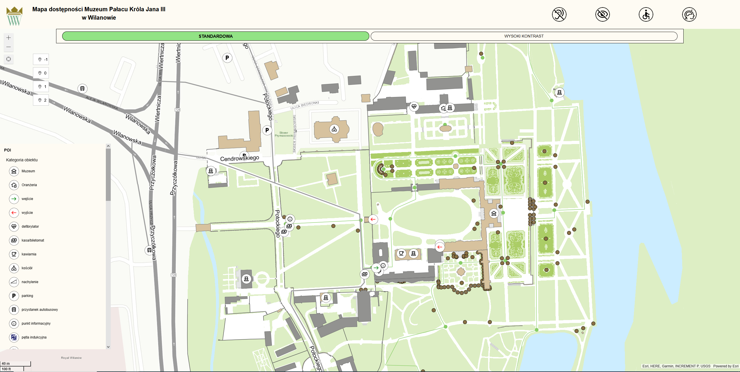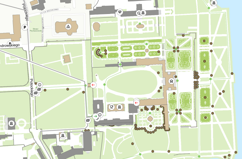 An inventory of trees and shrubs was made for the dedicated database; each tree was measured and described, and its age was also calculated. Currently, the database contains more than 3,000 trees, including 28 monuments of nature, whose documentation has been enriched with photographs and inventory cards. The geobase also contains layers that describe in great detail the plant and non-plant elements that comprise the individual Baroque parterres, or symmetrical layouts of garden beds.