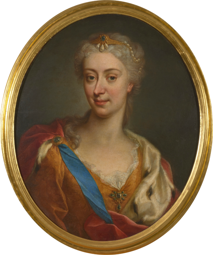 This depiction of the wife of the claimant to the thrones of England, Scotland, and Ireland appears on her monumental tomb of 1742, designed by Filippo Barigioni, in Saint Peter’s Basilica at the Vatican in Rome, the most important of all Catholic churches. The portrait on the tomb, held by a sculpted personification of Faith and a winged putto, was made as a mosaic by the Roman master Pietro Paolo Cristofari. The artist based the mosaic on the likeness of King Jan III’s granddaughter in this portrait by Lodovico Stern (1709–1777), a painter of Austrian origin, who moved to Rome around 1724.