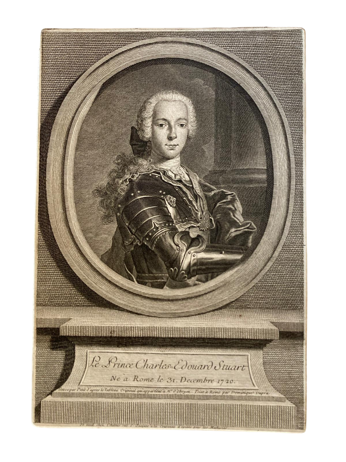 The portraits of the sons of the two princes are after originals by Domenico Duprà (1689–1770), who studied in Rome under Francesco Trevisani and then worked for the courts of the King of Portugal in Lisbon and of the King of Sardinia in Turin. All three original portraits were sent from Rome to be engraved in Paris. The inscription below Charles’ portrait states that the original belonged to Mr. d’Obryen. Daniel O’Brien was for many years King James’ agent in Paris. He joined the court in Rome in 1747 as one of the king’s ministers and was created Earl of Lismore.