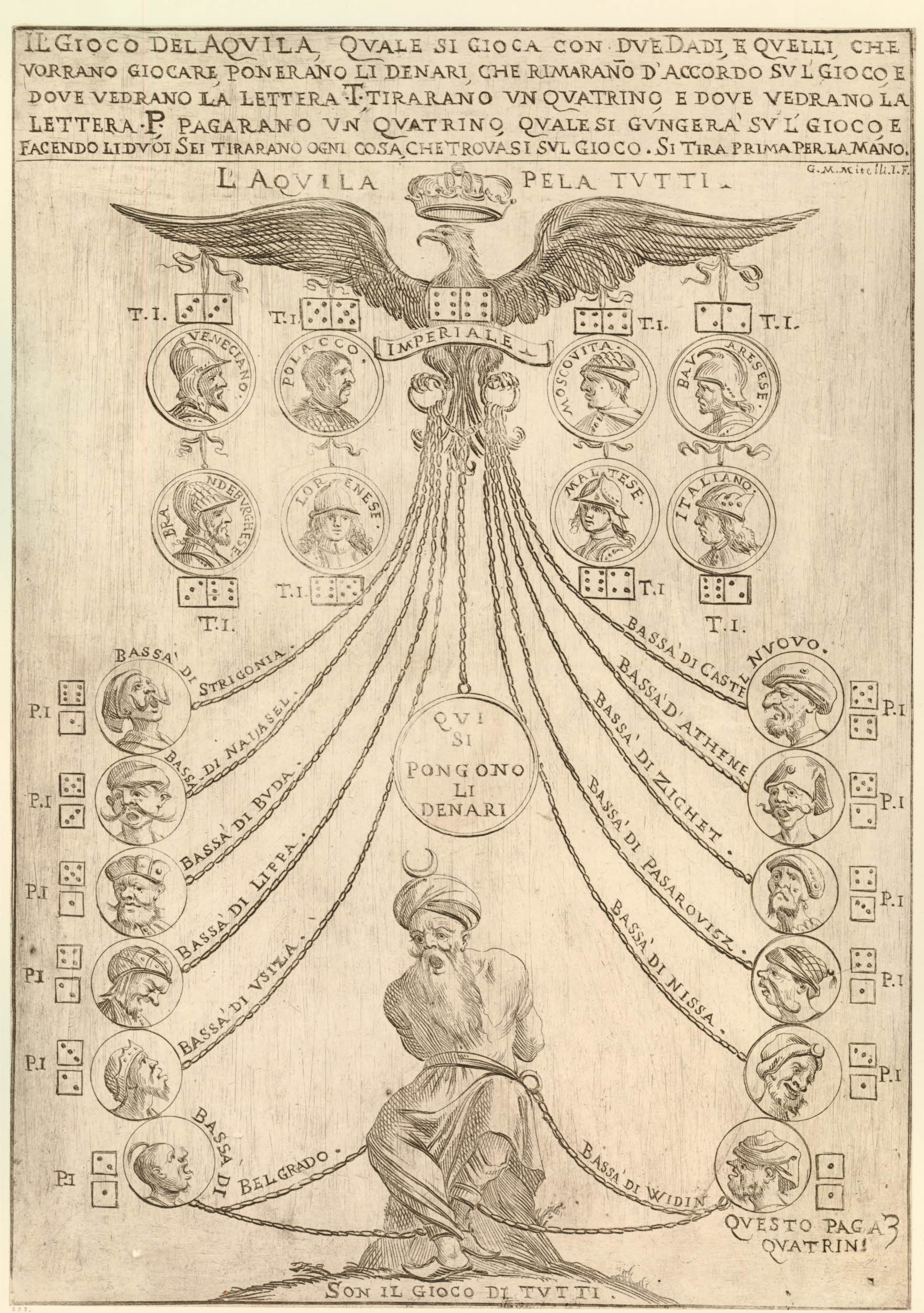 Il Gioco del Aqvila jest planszą do prostej gry w kości. W górnej części arkusza, pod krótkim opisem zasad, znajduje się koronowany orzeł cesarski i osiem wizerunków dowódców europejskich, podpisanych kolejno: VENECIANO, POLACCO, MOSCOVIA, BAVARESE, BRANDEBVRGHESE, LORENESE, MALTESE, ITALIANO. Orzeł trzyma w szponach łańcuchy, które prowadzą w kierunku dolnej części karty, gdzie ukazano dwunastu paszów. Przy każdym z dwudziestu wizerunków znajduje się kombinacja kości – jeśli wypadnie ta odnosząca do Turków, zawodnik przegrywa. Jeśli do Europejczyków – wygrywa. Na środku kompozycji zarezerwowano miejsce na pieniądze, o które ma toczyć się gra.