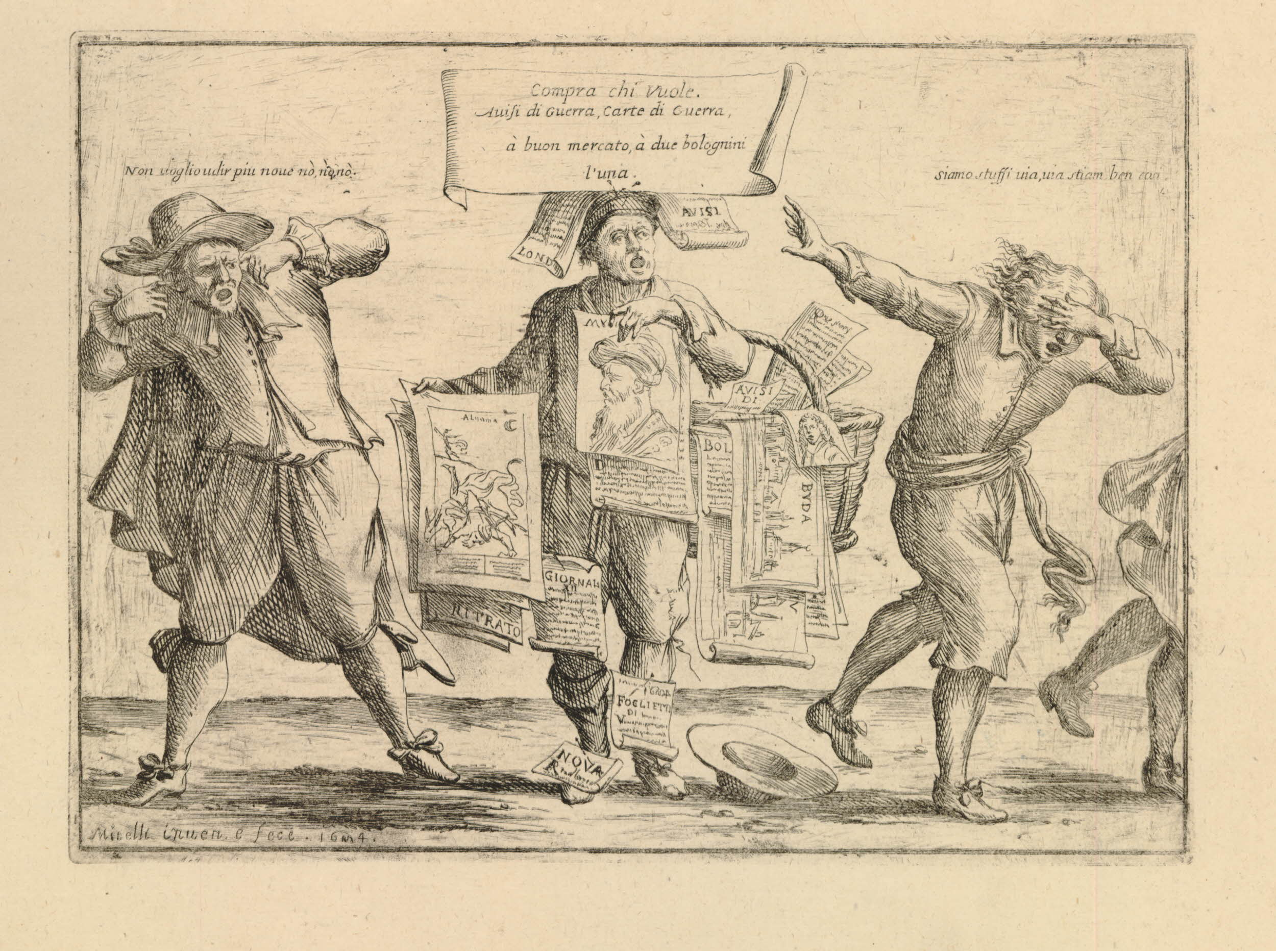 Wśród tych różnorodnych przedstawień jedna rycina przedstawia reakcje ludzi na doniesienia o wojnie i kolejnych starciach: Compra chi vuole (niech kupuje, kto chce) ukazuje sprzedawcę druków ulotnych, obwieszonego rozmaitymi kartkami i okrzykami reklamującego swój towar. Niesie on wielki kosz, z którego wystają rozmaite druki z przedstawieniami miast i portretami, a także gazety i ogłoszenia. Pliki papierów trzyma też w rękach. O tematyce tych druków dowiadujemy się z podpisu nad jego głową: Compra chi vuole, auisi di guerra, carte di guerra (Niech kupuje, kto chce, nowiny wojenne, ogłoszenia wojenne). Od jego krzyku, w obie strony ucieka dwóch mężczyzn: jeden zatyka sobie uszy, drugi, w biegu gubiąc kapelusz – zasłania oczy. Nad nimi umieszczono napisy: Non voglio udir piu noue no no no (Nie chcę już słuchać nowych. Nie, nie, nie!) i Siamo stuffi. uia, uia. Stiamo bene cosi (Mamy dość. Odejdź, odejdź. Dobrze nam, jak jest). Rycina pochodzi z 1684 roku.