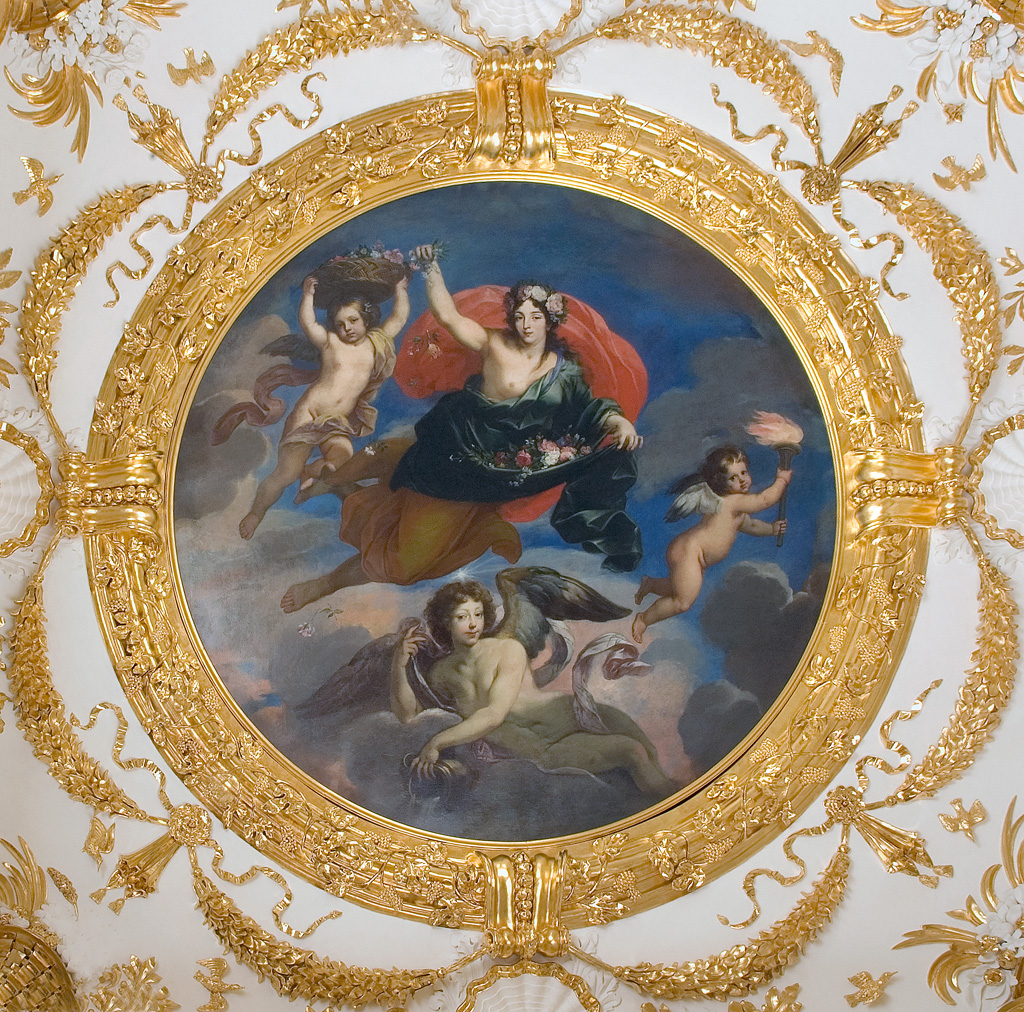 Malowidło w złotej ramie, otoczone złotymi sztukateriami - dekoracjami w formie płaskorzeźb. Jest to plafon, czyli obraz na suficie. Przedstawia młodą piękną kobietę w wianku na głowie, w otoczeniu anioła i dwóch małych putt. Kobieta „frunie” po niebie. Ubrana w czarną, żółtą i czerwoną draperię. Trzyma w niej kwiaty. Jest to "Jutrzenka", plafon Jana Reisnera w Gabinecie Zwierciadlanym w pałacu wilanowskim.