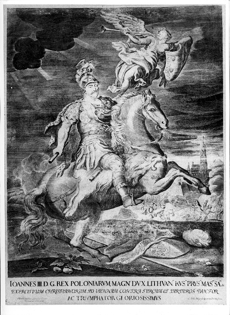 Do najokazalszych, powstałych w Polsce w końcu XVII w., rycin portretowych króla Jana III Sobieskiego należy jego wizerunek konny, wykonany i wydany w Warszawie przez Charlesa de la Haye, według pomysłu i rysunku (a może i obrazu?) Jerzego Eleutera Szymonowicza Siemiginowskiego. Ten reprezentacyjny miedzioryt o wymiarach 61 x 44, 5 cm, zwany również Apoteozą Jana III, gloryfikuje Sobieskiego jako wybawcę Wiednia ( o czym ma przypominać widniejąca w tle wieża katedry św. Stefana) i ówczesnego świata chrześcijańskiego od grożącej mu potęgi ottomańskiej. Monarcha – wódz, upozowany na rzymskiego imperatora, siedzi na wspiętym koniu, ubrany w antyczną zbroję karacenową i szyszak. Chwałę niezwyciężonego Lwa Lechistanu (co symbolizują atrybuty Herkulesa oraz porozrzucane pod kopytami końskimi trofea tureckie) głosi unosząca się nad nim uskrzydlona Fama z tarczą, oznaczającą tu równocześnie herb Sobieskich – Janinę.