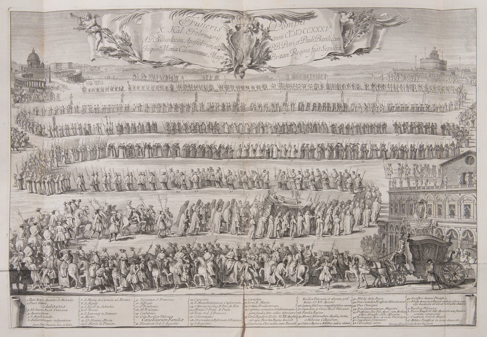 Kolejną ilustracją druku „Parentalia Mariae Clementinae…” było przedstawienie konduktu pogrzebowego Marii Klementyny, który wyruszył z kościoła Santi Apostoli do bazyliki św. Piotra, gdzie ostatecznie spoczęło ciało wnuczki Jana III. Kondukt zakręcający serpentynami, tworzy w sumie siedem równoległych odcinków, usytuowanych na coraz odleglejszych planach. Jego czoło zbliża się do placu św. Piotra, znaczone malutkimi sylwetkami uczestników; kawalkadę zamyka obita kirem karoca, odjeżdżająca spod fasady kościoła SS. Apostoli. Na drugim planie alumni narodowych kolegiów angielskich, szkockich i irlandzkich, trzymając płonące pochodnie, otaczają wysokie mary z ciałem królowej, ubranym w monarsze (a nie zakonne) szaty. W górze kompozycji unosi się lekko sfalowana, szeroka wstęga z napisem, rozdzielonym rokokowym kartuszem zwieńczonym koroną, w którym widnieje 5 pól z herbami Polski. Serce Marii Klementyny pozostało w marmurowej urnie, w jej epitafium w kościele Santi Apostoli. Sztych sporządził rzymski rytownik Rocco Pozzi (zm. ok. 1780). Pod kompozycją znalazła się legenda z opisem osób uczestniczących w orszaku.