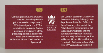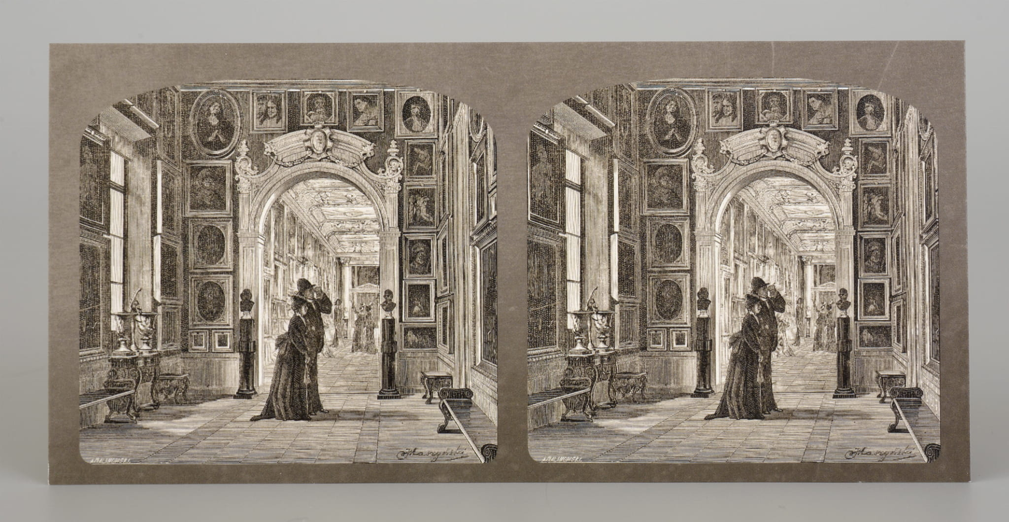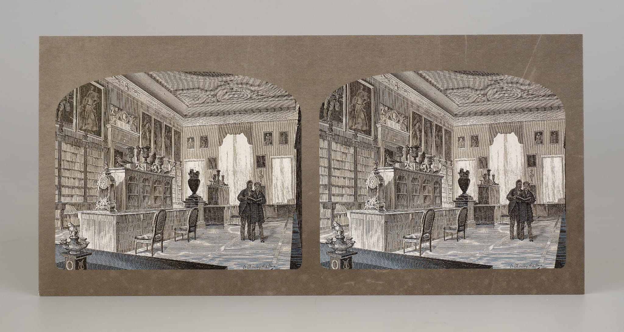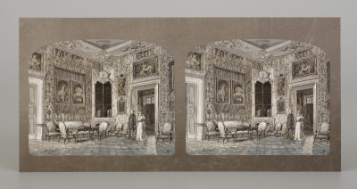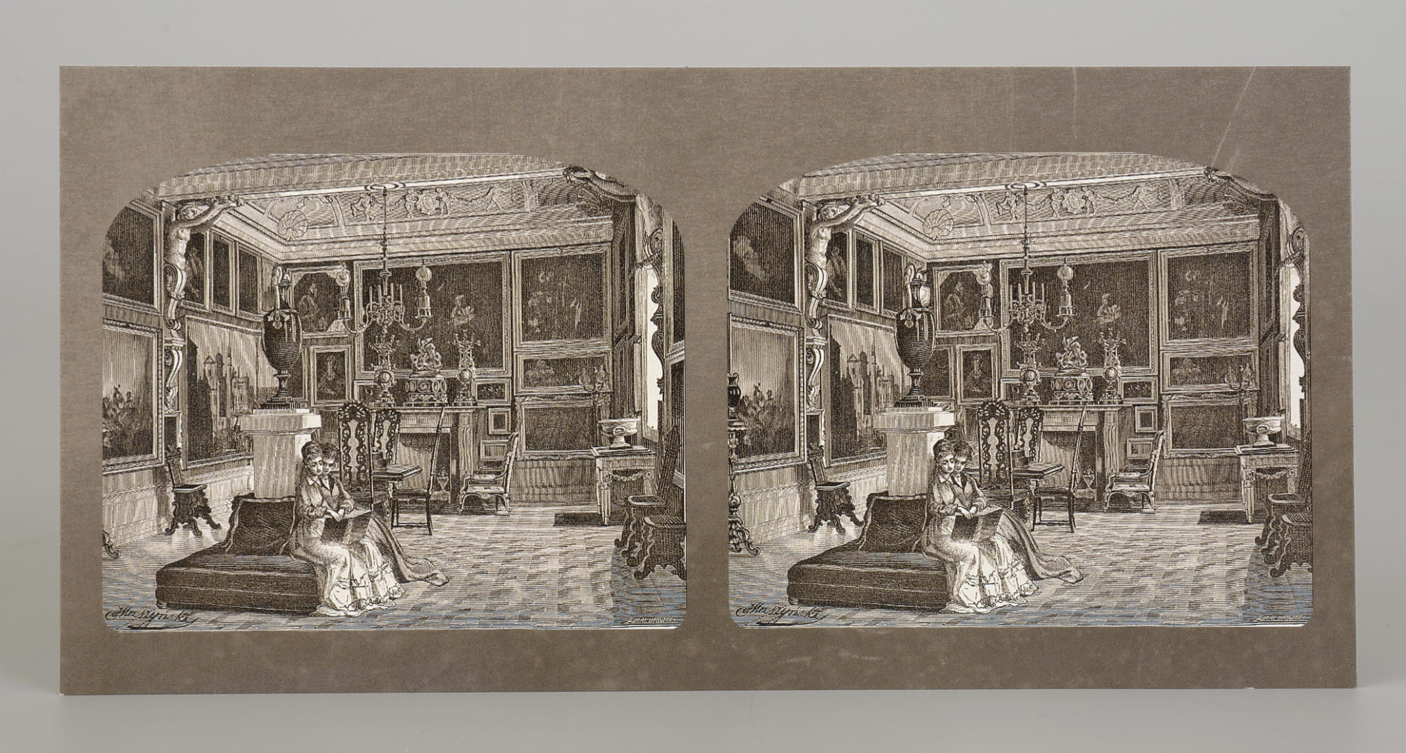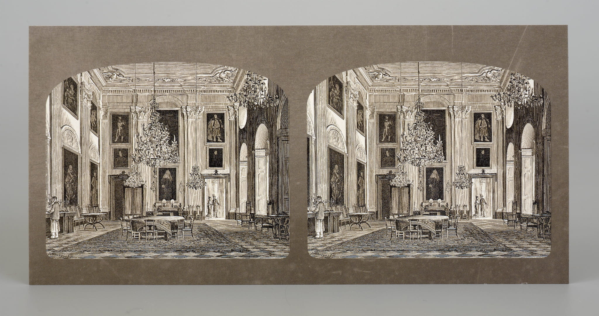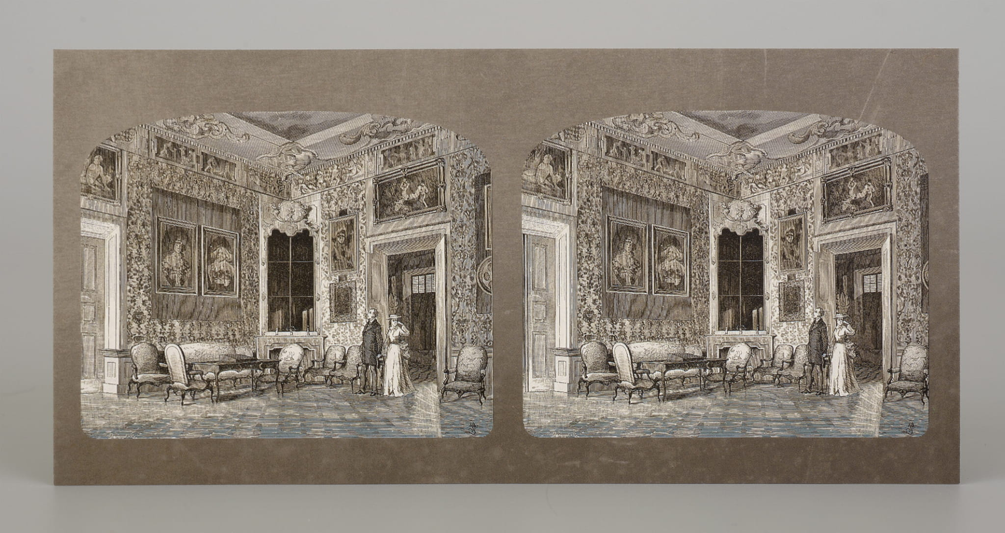 Karty wymienne do stereoskopów 3D z trójwymiarowymi zdjęciami i grafikami ukazującymi dawne wnętrza i okolice Pałacu w Wilanowie.