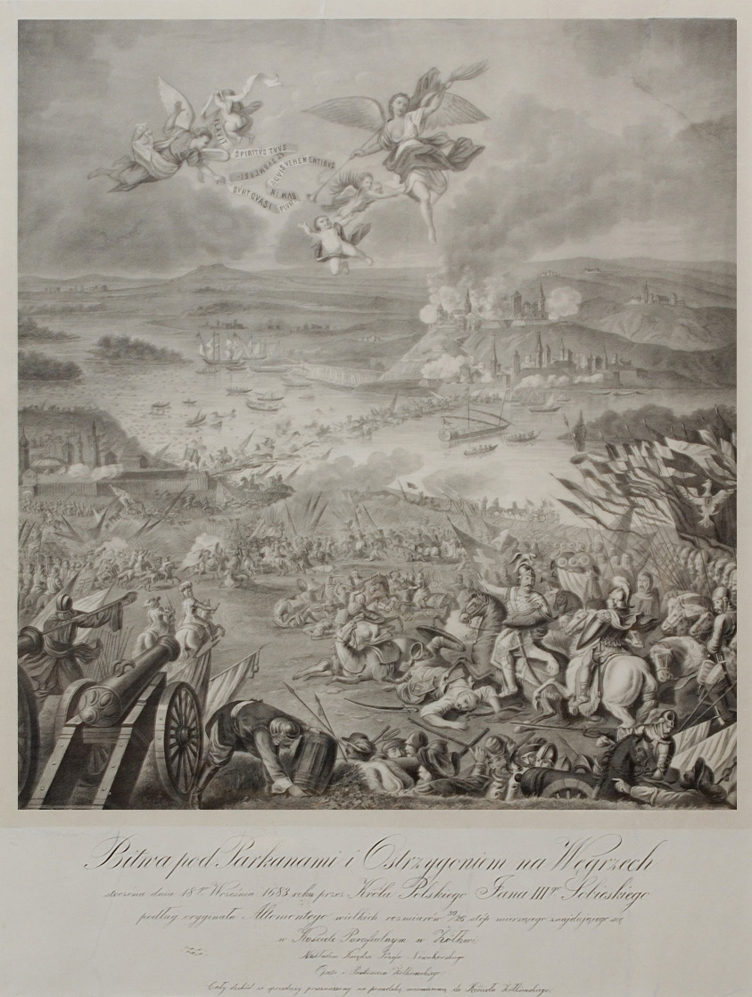 Bitwa pod Parkanami. Litografia na papierze. Ukazuje zwycięską bitwę Jana III Sobieskiego. Kompozycja ukazuje moment, w którym polskie wojska zyskują przewagę, zmuszając siły tureckie do ucieczki. Walki toczą się wzdłuż brzegu Dunaju, który zajmuje środkową część obrazu. W oddali miasto. Na niebie anioły z szarfami na których widnieją napisy.