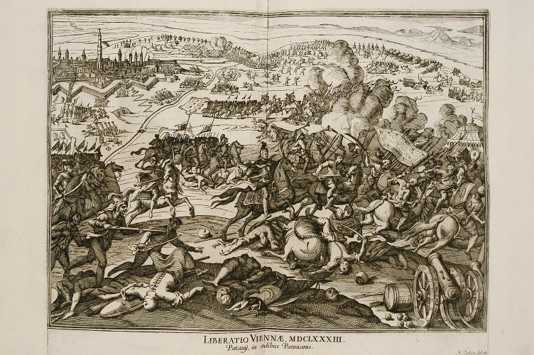 Rozległe pole bitewne w wysoko usytuowanym horyzontem, na bliższych planach wre walka. Wśród kłębowiska jeźdźców, w centrum kompozycji, widoczny Jan III na wspiętym koniu. Król w szyszaku rycerskim, w pełnej zbroi i w płaszczu, trzyma w prawej ręce szablę. Za nim królewicz Jakub konno prowadzi do ataku hufce polskiej jazdy. Przed Sobieskimi pierzcha konnica turecka z chorągwią wezyra. Na pierwszym planie, na zboczu, polegli Turcy oraz podchodząca piechota wojsk sprzymierzonych. W głębi namiot turecki, przemieszczające się wojska oraz panorama ufortyfikowanego Wiednia. U dołu napis: LIBERATIO VIENNAE MDCLXXXIII. / Patauÿ, in aedibus Patinianis.