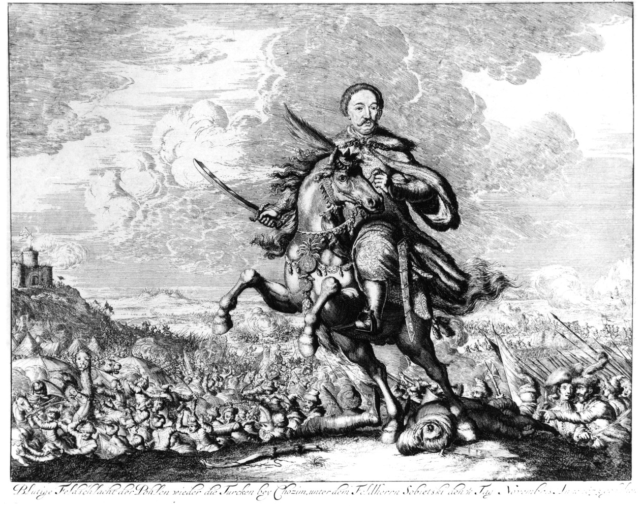 Jan Sobieski na koniu na tle pola bitewnego Gloryfikacja Jana Sobieskiego na tle bitwy chocimskiej, ryt. Jan Luyken wg Romeyna de Hooghe, 1677-1683, Biblioteka Narodowa Fot. egz. ze zbiorów Biblioteki Narodowej