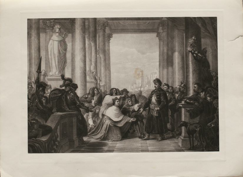 Rycina jest powtórzeniem kompozycji Henryka Rodakowskiego znanej tradycyjnie pod tytułem Hrabia Wilczek błagający króla Jana Sobieskiego o pomoc dla Wiednia przeciw Turkom i przedstawia moment, gdy przed oblicze polskiego monarchy przybyli ambasadorowie cesarza Leopolda I i papieża Innocentego XI. Identyfikacja cesarskiego wysłannika jako hrabiego Heinricha von Wilczka budzi jednak wątpliwości historyków, którzy wskazują, że Wilczek miał wówczas jedynie 18 lat. Przed Sobieskim stanęli więc prawdopodobnie baron Johann Christoph Zierovsky, reprezentujący cesarza i nuncjusz papieski Opizio Pallavicini. Polski król ukazany został w monumentalnym wnętrzu, którego dostojne kolumny podkreślają majestat władcy. Przed monarchą klęczą ambasadorowie królewskich sojuszników. Tradycja podaje, że nie była to formalna, dyplomatyczna prośba, ale błagalne wezwanie na pomoc skierowane do króla, doświadczonego wojownika w walce przeciwko potędze tureckiej.