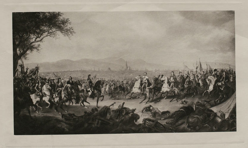 Jedna z dwóch grafik ilustrujących pełne napięcia sceny ze stosunków dyplomatycznych króla Jana III z dworem habsburskim. Dnia 15 września w niewielkiej osadzie Schwechat w okolicach Widednia dowóda zjednoczonych sił europejskich, Jan III Sobieski, przyjął podziękowanie od cesarza Leopolda I. Moment ten opisałw liście do ukochanej żony: Przywitaliśmy się tedy dosyć ludzko: uczyniłem mu komplement kilką słów po łacinie; on tymże odpowiedział językiem, dosyć dobrymi słowami.