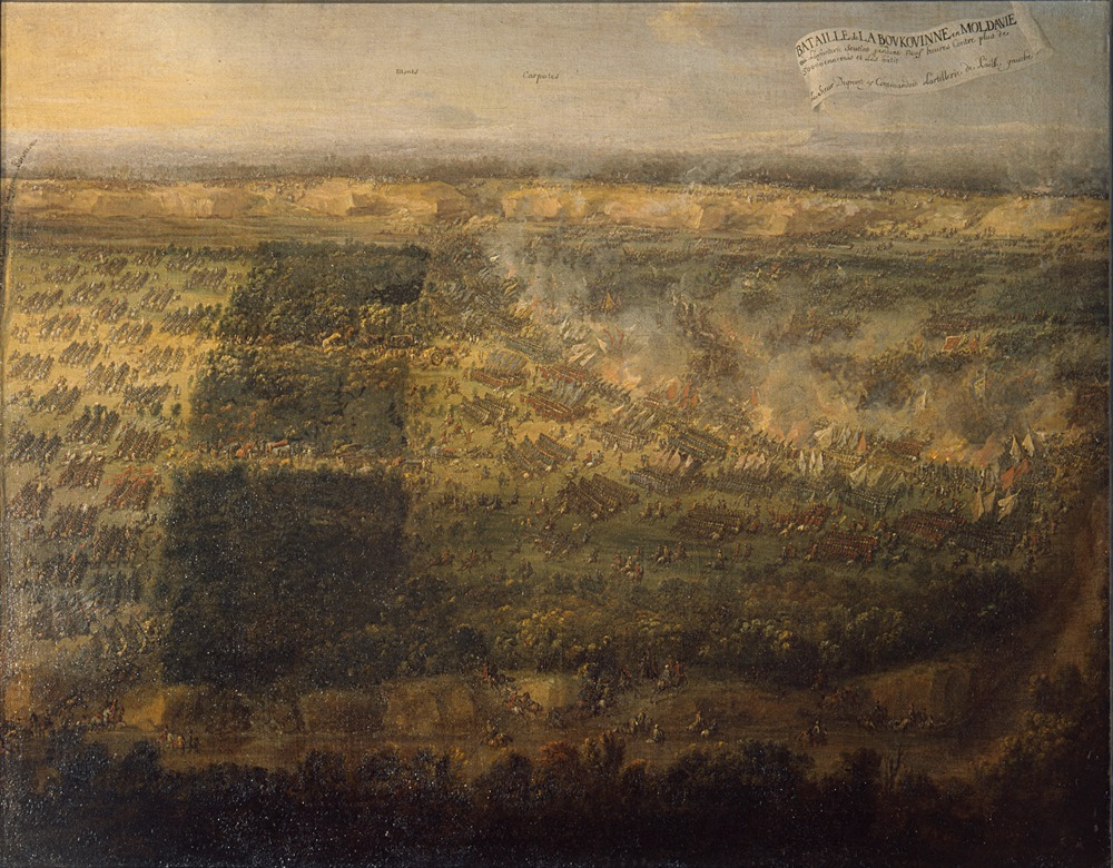 Jak w większości obrazów z cyklu, temat identyfikuje napis na banderoli, tu umieszczony w prawym górnym rogu: BATAILLE de LA BVKOVINNE en MOLDAVIE ou L’infanterie Soutint prudant Naeuf heures Contre plus de 50000 ennemis et Les bâtit Le Sieur Dupont y Commandoit L’artillerie de Laible gauche.
