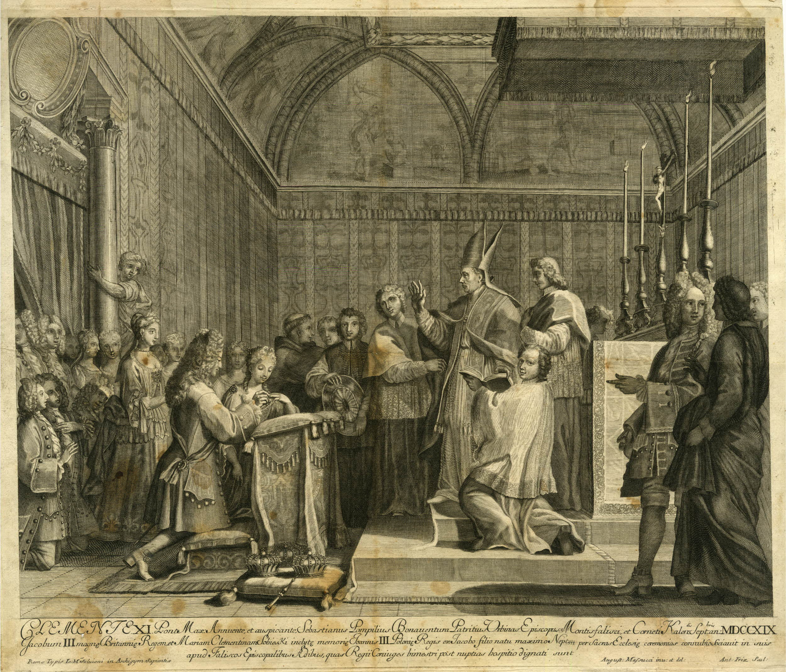 Rycina niemieckiego rytownika działającego w Rzymie, Antona Fritza, przedstawia drugą ceremonię zaślubin Marii Klementyny Sobieskiej i Jakuba Edwarda Stuarta, która odbyła się w katedrze we włoskim Montefiascone. W centrum kompozycji klęczy para małżonków, którą błogosławi miejscowy biskup.